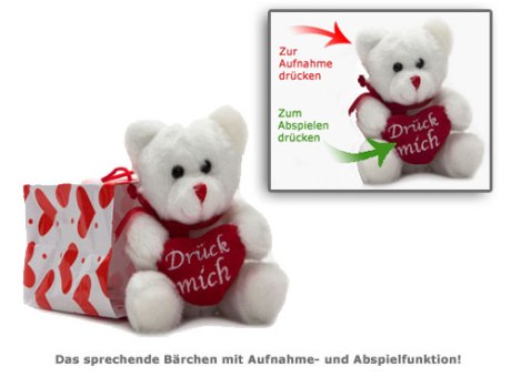 Gesprochene Botschaften gehen direkt ins Herz - mit dem sprechenden Bärchen! Dieser niedliche Teddy liefert aufmunternde Worte, eine zärtliche Liebeserklärung oder die Einladung zum romantischen Dinner und lässt sich immer wieder neu besprechen. Um Deine Stimme aufzunehmen, halte das Ohr des treu blickenden Bärchens fest. Folgt deine Liebste, dein Liebster der Aufforderung, das Herz zu drücken, spricht Knut deine Liebesbotschaft.