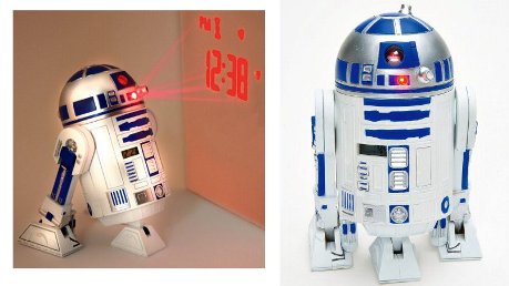 Stell dir vor: R2D2-Wecker mit kleiner LCD-Anzeige mit aktueller Uhrzeit und – mit Knopfdruck – die aktuelle Alarmzeit. Toll! Sollte dir das aber zu wenig sein, dann bediene – ebenfalls per Knopfdruck – die Projektionseinrichtung …und schon ist an der nächsten Wand (optimal 2 m entfernt) die Uhrzeit, und es werden die typischen R2D2-Geräusche erzeugt. Gänsehautmässig. Na, wenn du dann nicht aus dem Bett springst!
