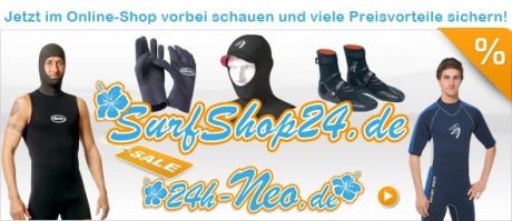 Mit SurfShop24.de kann ich euch einen Onlineshop präsentieren, der eine gute Produktauswahl zu vernünftigen Preisen anbietet. Hier findet ihr nicht nur Neoprenanzüge, Schuhe, Handschuhe, Shirts und Unterzieher. Ein umfangreiches Angebot an Surf- und Kite-Zubehör rundet das Angebot hervorragend ab.