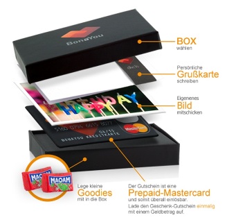 Ab sofort gibt es einen Geschenk- Gutschein der überall einlösbar ist. Das Besondere an BonaYou, der Gutschein ist eine einmalig aufgeladene Geldkarte (Prepaid MasterCard) und kann somit überall dort eingelöst werden wo mit einer MasterCard gezahlt werden kann.
