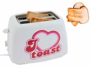 Besonders empfehlenswert für Verliebte, denen so früh am Tag Stimme oder Worte fehlen, um den neuen Liebestag strahlend zu beginnen. Da gibt euch der romantische Toaster jetzt tatkräftig Unterstützung. Jede Scheibe – muss ja nicht GOLDEN TOAST sein - ist bestückt mit dieser Liebesbotschaft „I love you“ und zergeht auf der Zunge wie … Fantasie habt ihr selbst. (angegebene)