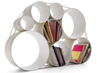 Acht Fiberglasröhren unterschiedlicher Durchmesser bilden in einer beliebigen Zusammenstellung ein Regal. Zwei Textilgurte halten diese coole Konfiguration zusammen. So entstehen wirklich ungewöhnliche, aber funktionale Regalflächen, die der Ordnung des Alltags dienen.